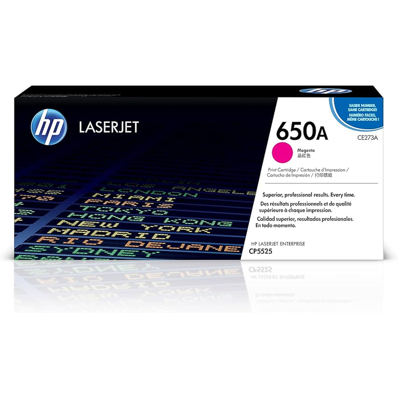 Genuine HP 650A magenta toner for CP5525 and M750; up to 15,000 pages.